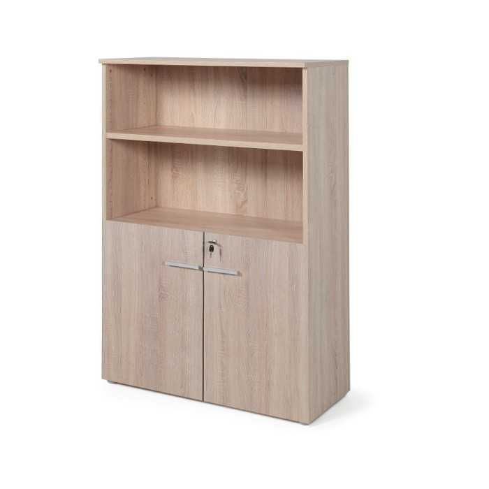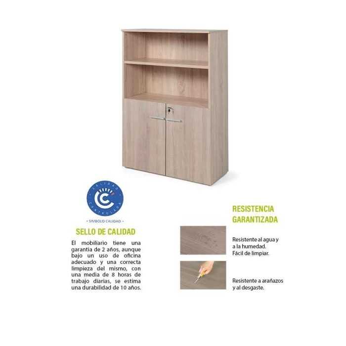 Este armario combina estantes a la vista y puertas bajas cuyas medidas son 93 cm de ancho, 42,5 cm de fondo y altura total de 141,6 cm.. Está fabricado en melamina de 19 mm de espesor e incluye 3 estantes regulables en altura.