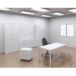 Despacho completo equipado con mesa operativa, cajonera y 4 armarios. El despacho de oficina tipo E dispone de una mesa operativa modelo portico que se caracteriza por su tablero de 25 mm de espesor fabricado en melamina y su estructura de 4 patas rectangulares en acabado de aluminio, negro o blanco. Esta mesa tiene un ancho de 160 cm y fondo de 80 cm lo que permite que sea una mesa ideal para oficinas.