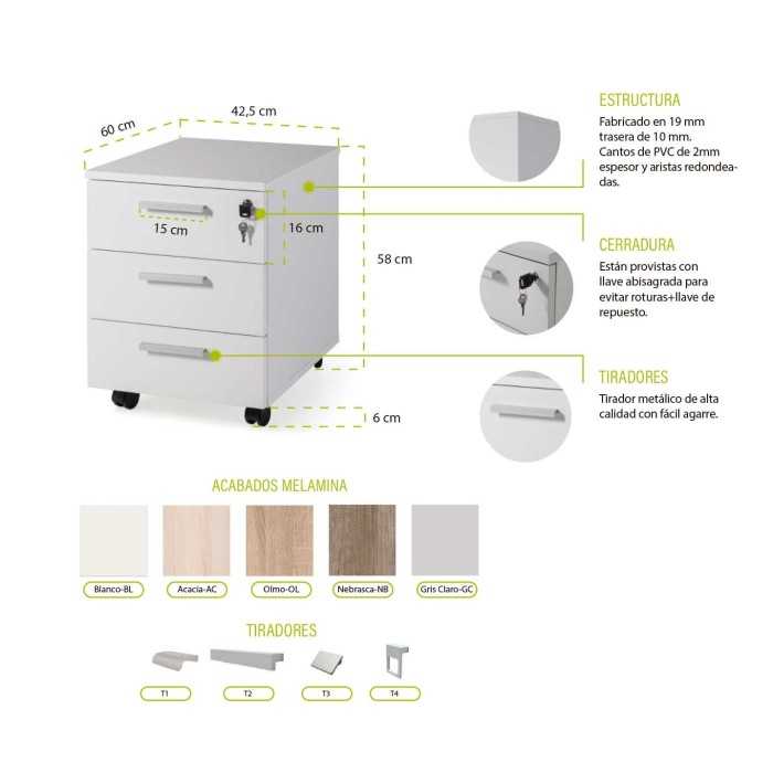- Medidas cajonera (Ancho, Fondo, Alto) 42,5 x 60 x 58 cm