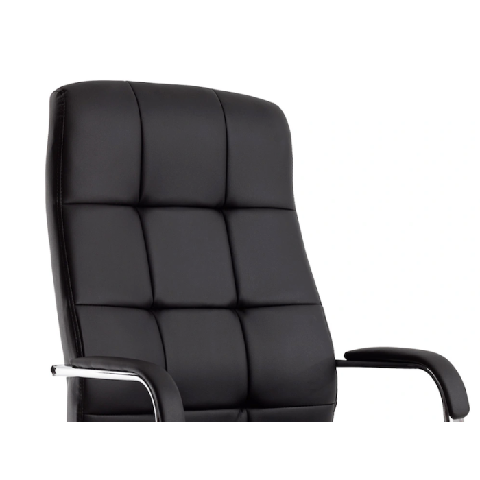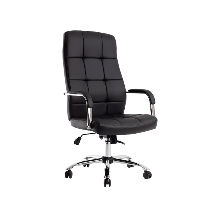 El asiento y el respaldo están cuidadosamente acolchados con un diseño de figuras cuadradas, proporcionando no solo un soporte ergonómico sino también un atractivo visual que realza cualquier oficina.
