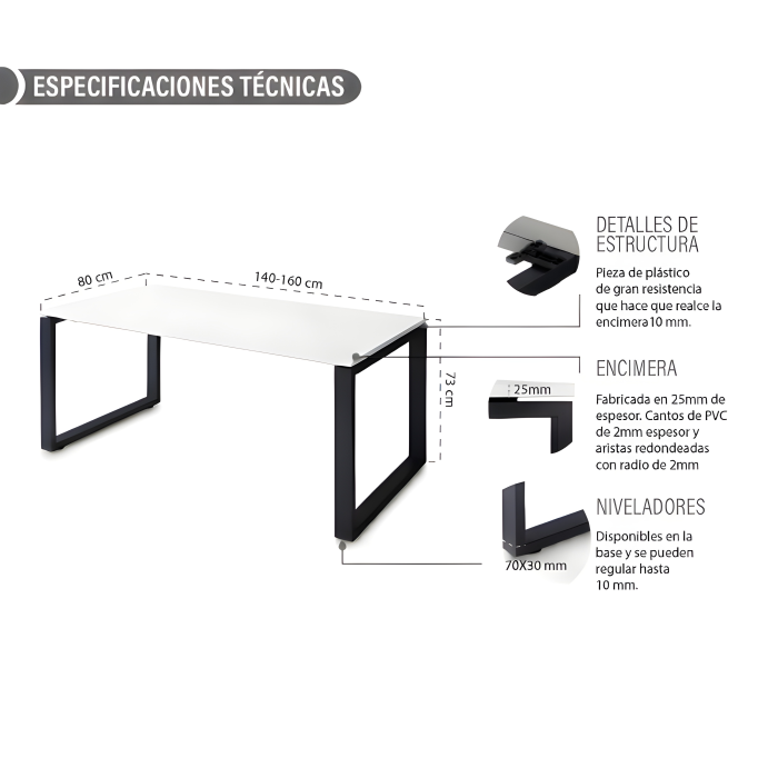 La mesa recta SKALA se caracteriza por la forma de sus patas. Se trata de una mesa operativa recta de 140-160 cm de ancho con 80 cm de fondo y una altura de 73 cm. Su altura es variable ya que dispone de niveladores regulables en altura en las bases de sus patas.