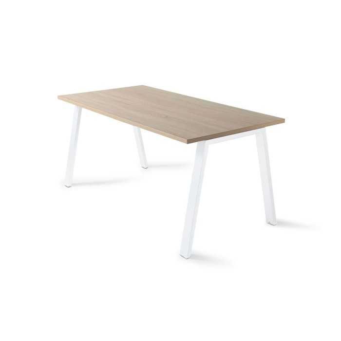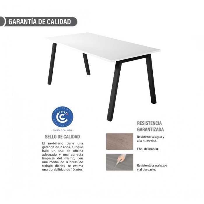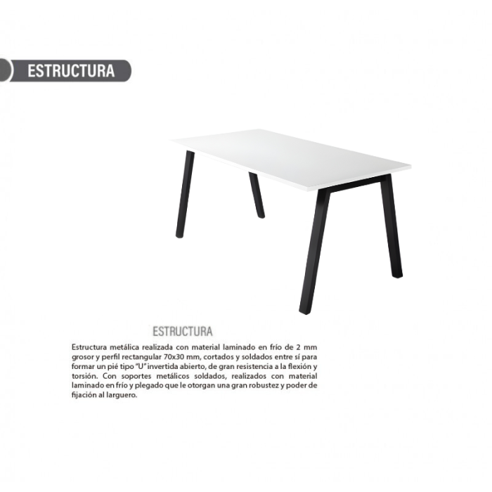 Lo más característico de esta mesa de oficina es su estructura. Dispone de una estructura 4 patas fabricadas en tubo de acero rectangular totalmente soldados entre sí. Sus pies son en forma de U invertida con una ligera apertura que se caracterizan por ser de gran resistencia a la flexión y torsión y están disponibles tanto en blanco como en negro. Con soportes metálicos soldados, realizados con material laminado en frío y plegado que le otorgan una gran robustez y poder de fijación al larguero.