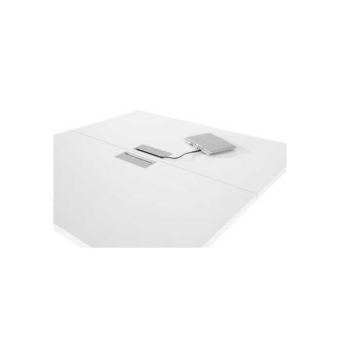El tablero está fabricado en melamina de 38 mm de espesor y sus cantos son de 2 mm. Su diseño incorpora 4 pasacables centrales con un acabado elegante en aluminio. Las medidas de los pasacables son 120 x 100.