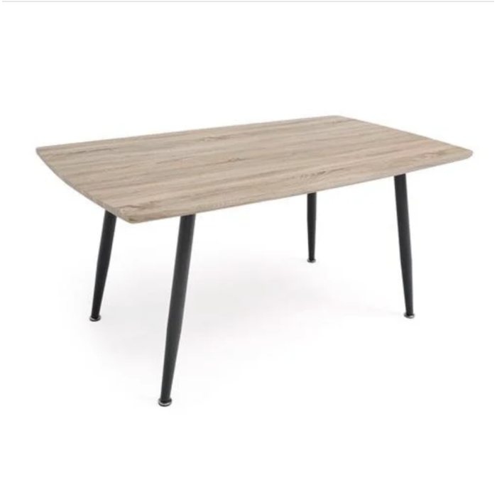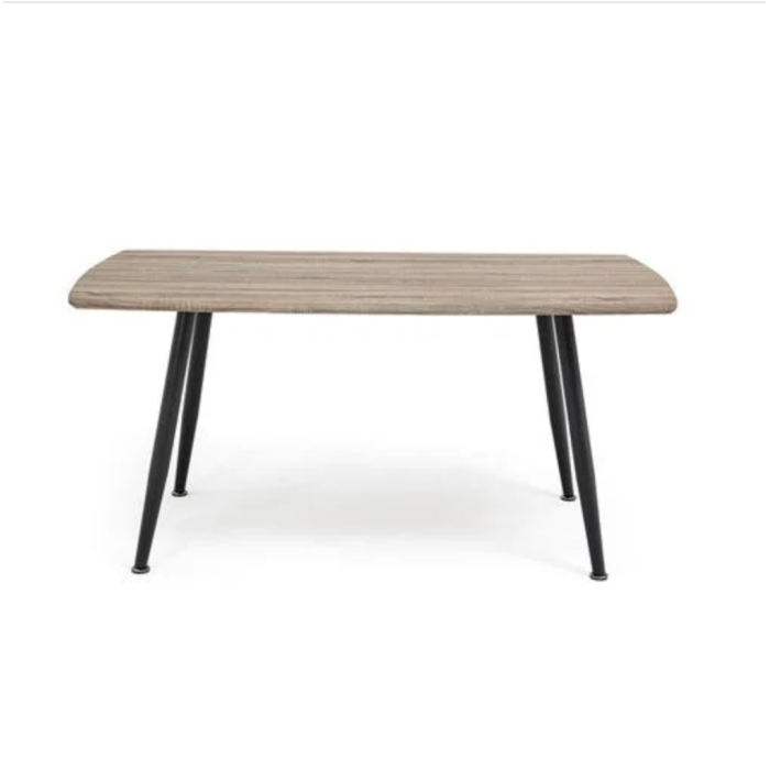 • La estructura de la mesa está formada por cuatro patas metálicas, que le dan estabilidad y firmeza. Las patas son de color negro, lo que crea un contraste con el tablero de color nogal o roble veteado claro. El metal es un material que se caracteriza por su resistencia y su fácil mantenimiento, y que aporta un toque moderno y minimalista al conjunto.