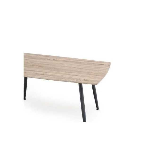 - La estructura de la mesa está formada por cuatro patas metálicas, que le dan estabilidad y firmeza. Las patas son de color negro, lo que crea un contraste con el tablero de color nogal o roble veteado claro. El metal es un material que se caracteriza por su resistencia y su fácil mantenimiento, y que aporta un toque moderno y minimalista al conjunto.