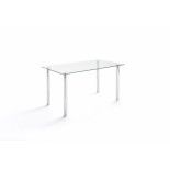 La mesa de cristal SORAYA es la representación del minimalismo más absoluto porque está formada por su tapa de cristal templado y sus cuatro patas de sección cilíndrica en acero cromado de gran calidad y estabilidad.