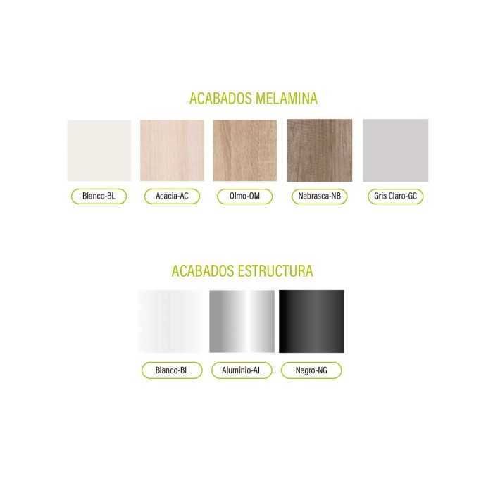 Su tablero es fabricado en melamina con un espesor de 25 mm y cantos de 2 mm en PVC. Disponemos de 5 acabados de color a elegir para la madera. Los colores disponibles son Blanco, Gris Claro, Acacia, Olmo y Nebraska.