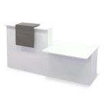 Con el mostrador de recepción BASIC estamos apostando en presencia, calidad y funcionalidad ya que esta composición está formada por 2 módulos que forman un bonito mostrador en el cual podemos diferenciar una zona alta gracias al módulo recto con sobremostrador y una zona para personas con discapacidad por el módulo de minusválidos.