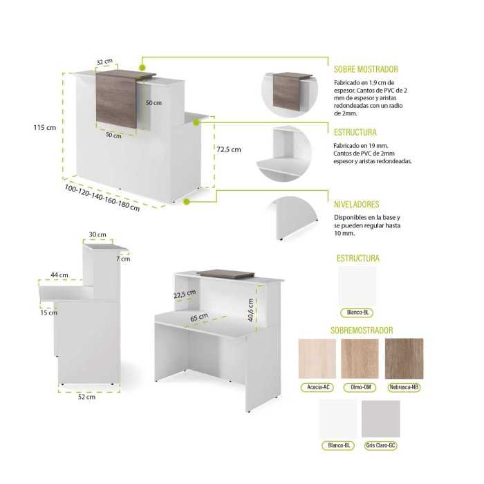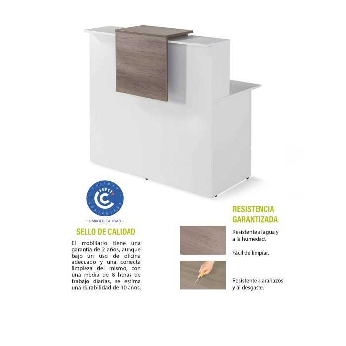 Además, al tratarse de un producto de fácil limpieza y cuidado estará impoluto en todo momento ya que con un simple trapo húmedo tendremos el mobiliario en perfectas condiciones para atender a nuestros clientes. Con una altura total de 115 cm hasta su encimera superior, es ideal para atender al público de forma sentado ya que dispone de un tablero interior en forma de mesa con 65 cm de fondo permitiéndonos contar con el espacio suficiente para colocar nuestro ordenador así como el archivo o documentación que necesitemos para realizar nuestra labor.