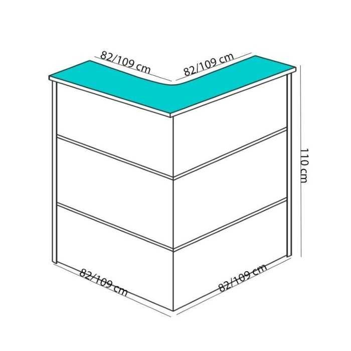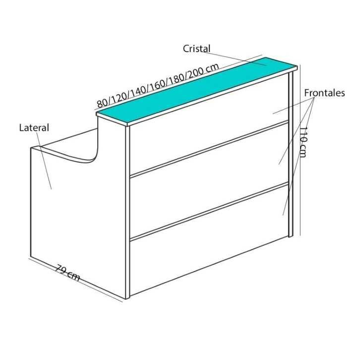 En resumen, nos encontramos ante una bonita composición de grandes dimensiones que es el mobiliario perfecto para colocar en recepciones de gran tamaño en las que necesitamos establecer varios puestos de trabajo para atender a los clientes o visitas que entran en nuestro local. Esta composición está formada por 1 módulo recto ancho a elegir entre 80 y 200 cm con encimera de cristal, 1 módulo en esquina de 82 o 109 cm y 1 módulo de minusválidos.
