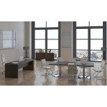 Incluye una práctica mesa de reunión a juego con este despacho, el tablero está fabricado con las mismas características que le mesa de despacho e incluye 2 prácticas bases cuadradas en acabado aluminio cromado, la mesa de reunión está disponible en medidas 240 x 100 cm o 200 x 100 cm, según las necesidades del usuario