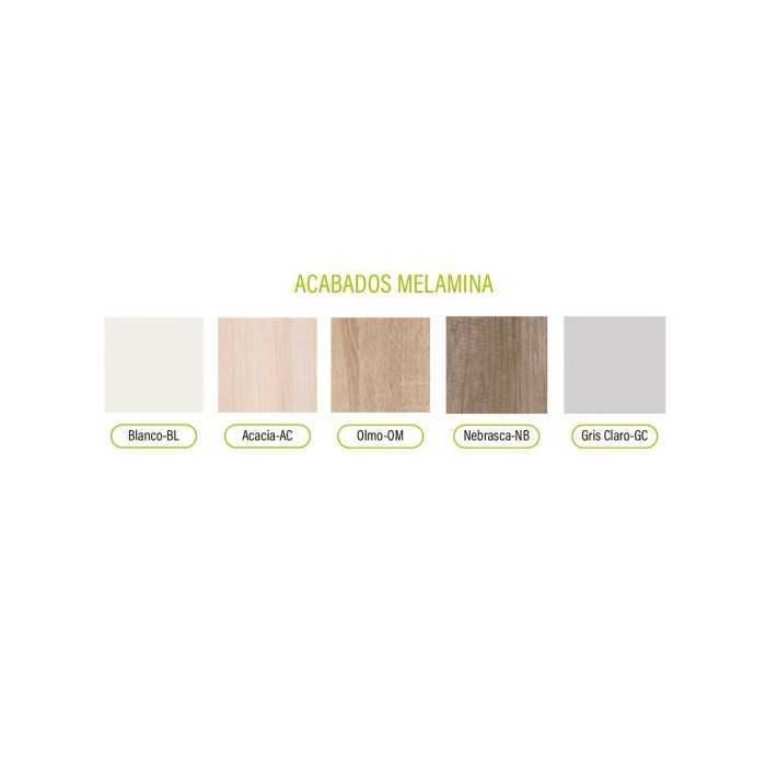Su tablero es un tablero fabricado en melamina de 19 mm de espesor disponible en Blanco, Olmo, Gris Claro, Acacia y Nebraska a elegir. Dispone de unos cantos de 2 mm fabricados en PVC.