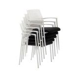 Sus brazos son fijos y están integrados en la propia estructura de la silla. Están fabricados en polipropileno de color blanco. Su estructura es de 4 patas fabricadas con tubo de acero redondo en terminación epoxi. Incluye tacos que apoyan en el suelo y que al mismo tiempo protegen las patas al apilar la silla porque se trata de una silla totalmente apilable que permite hasta 8 niveles.