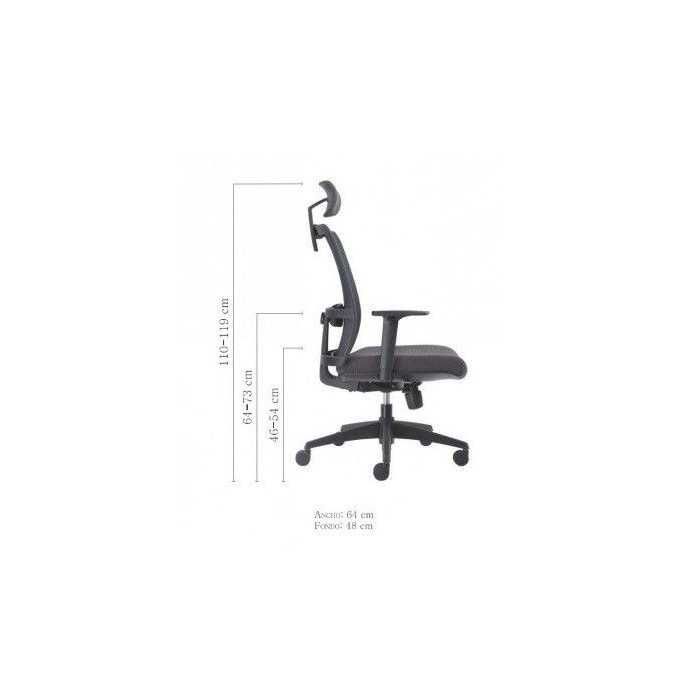 Las medidas de esta silla operativa giratoria son 64 cm de ancho, 48 cm de fondo y altura de 110-119 cm con cabezal incluido.