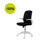 El asiento está fabricado con espuma de goma tapizada en tela en acabado negro, se adapta a cualquier estilo o decoración. Incorpora brazos abatibles de polipropileno en acabado blanco.
