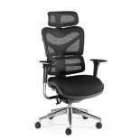 Se trata de una silla giratoria con respaldo alto y cabecero regulable en la parte superior. Este respaldo dispone de soporte lumbar y está fabricado con malla de alta resistencia en acabado negro.