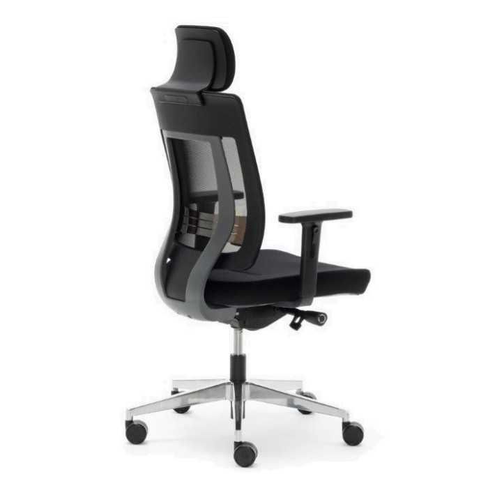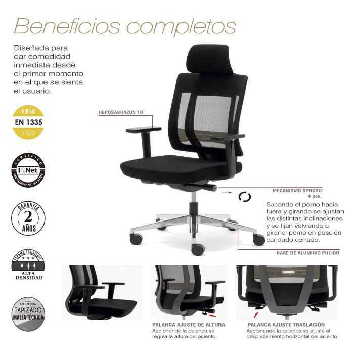 En cuanto a ergonomía, incorpora la tecnología más avanzada. Tiene un mecanismo syncron que permite la regulación del asiento y respaldo que permite el bloqueo en 4 posiciones. Además, dispone de sistema anti-retorno del respaldo lo que impide golpear al usuario con la liberación del mecanismo. También de serie incluye traslación del asiento mediante un sistema de palanca corredera bajo el asiento que permite ajustar la profundidad en función de la altura del usuario.